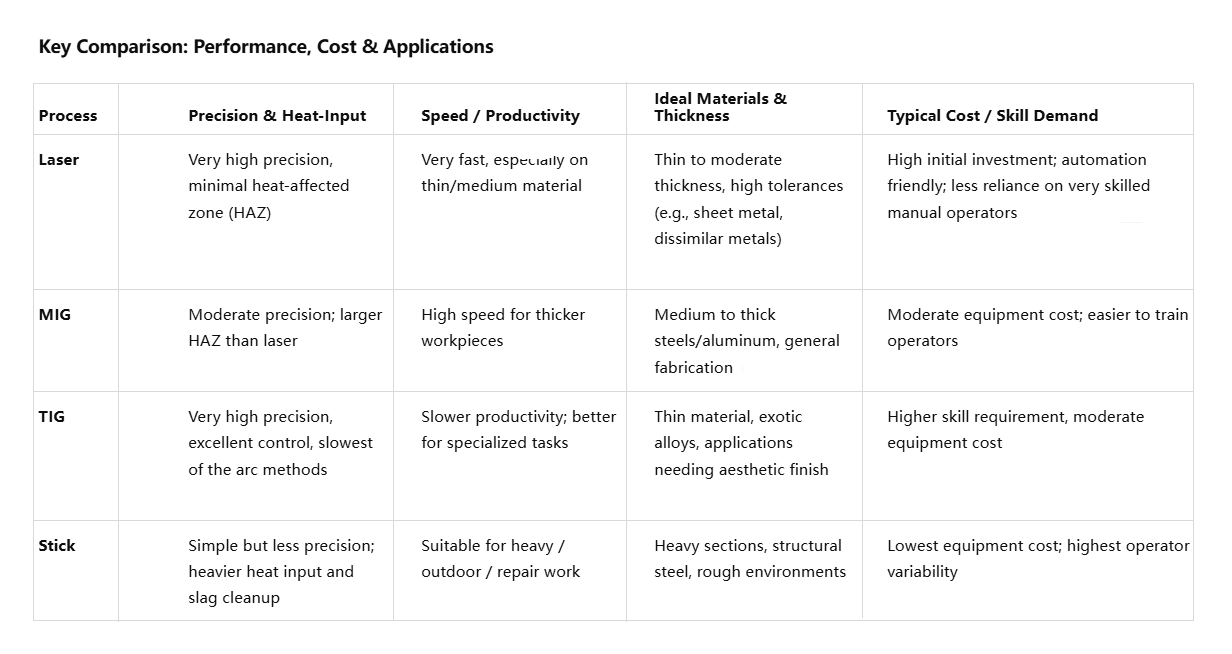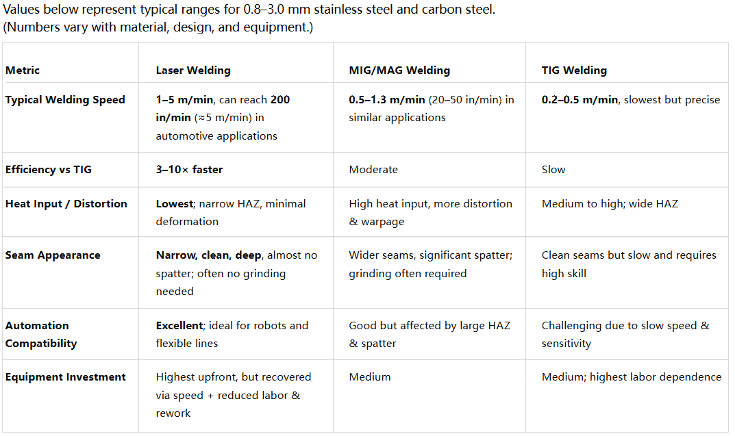 Multiple studies show laser welding can be 3–10× faster than TIG and significantly faster than MIG/MAG in thin to mid-thickness metals.